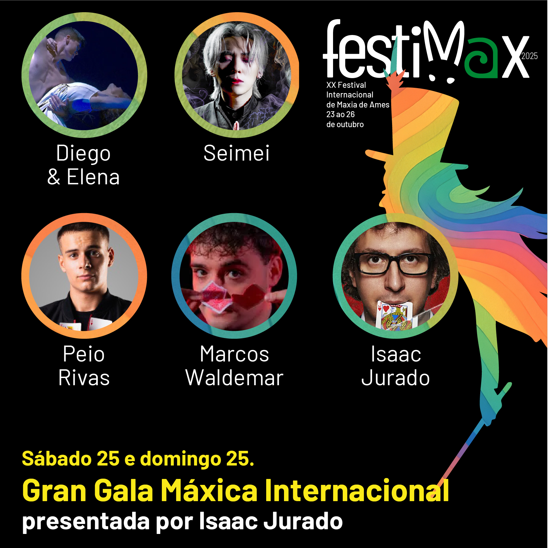 Presenta ISAAC JURADO (Cataluña): Experto en humor e cun toque moi persoal. Participan: • SEIMEI (Corea do Sur): un gran artista referente no continente asiático. Chega a Galicia para presentar por primeira vez en Europa o seu número máis recente. Unha viaxe pola maxia tradicional asiática nunca antes vista.As máscaras e os abanos serán os principais elementos que pasarán polas mans deste habilidadoso artista. • MARCOS WALDEMAR (Lugo): Unha auténtica mente creativa, recente gañador de dous premios nacionais de maxia no último Congreso Máxico Nacional. Un dos artistas galegos máis emerxentes, presentará na Gran Gala de Festimax o seu número estrela. • PEIO RIVAS (País Vasco): Experto en manipulación de obxectos, unha das ramas máis complicadas do ilusionismo. Cartas que aparecen nos seus dedos a un ritmo trepidante. Unha mestura de xuventude e elegancia a partes iguais. • DIEGO e ELENA (Madrid): Un dos números máis aclamados nos principais Festivais de Maxia de todo o mundo. Unha proposta nunca antes vista, a mestura de dúas disciplinas: As acrobacias aéreas e o Quick Change. Serán os encargados de poñer o broche de ouro ao Festimax 2025.