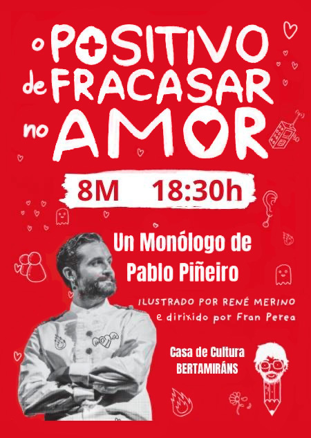Lo positivo de fracasar en el amor é un monólogo teatral no que Pablo Piñeiro desmenuza a súa obra literaria do mesmo nome e se desnuda —metaforicamente— ante o público para compartir o seu proceso persoal: dun mozo “analfabeto emocional” a alguén que aprendeu a cuestionar os mitos do amor romántico, os mandatos de xénero e as expectativas que condicionan as nosas relacións. Con humor, honestidade e historias nas que é doado recoñecerse, o espectáculo convida a reflexionar sobre como aprendemos a amar, como nos afectan os roles e que significa construír vínculos máis sans, máis conscientes e máis igualitarios.