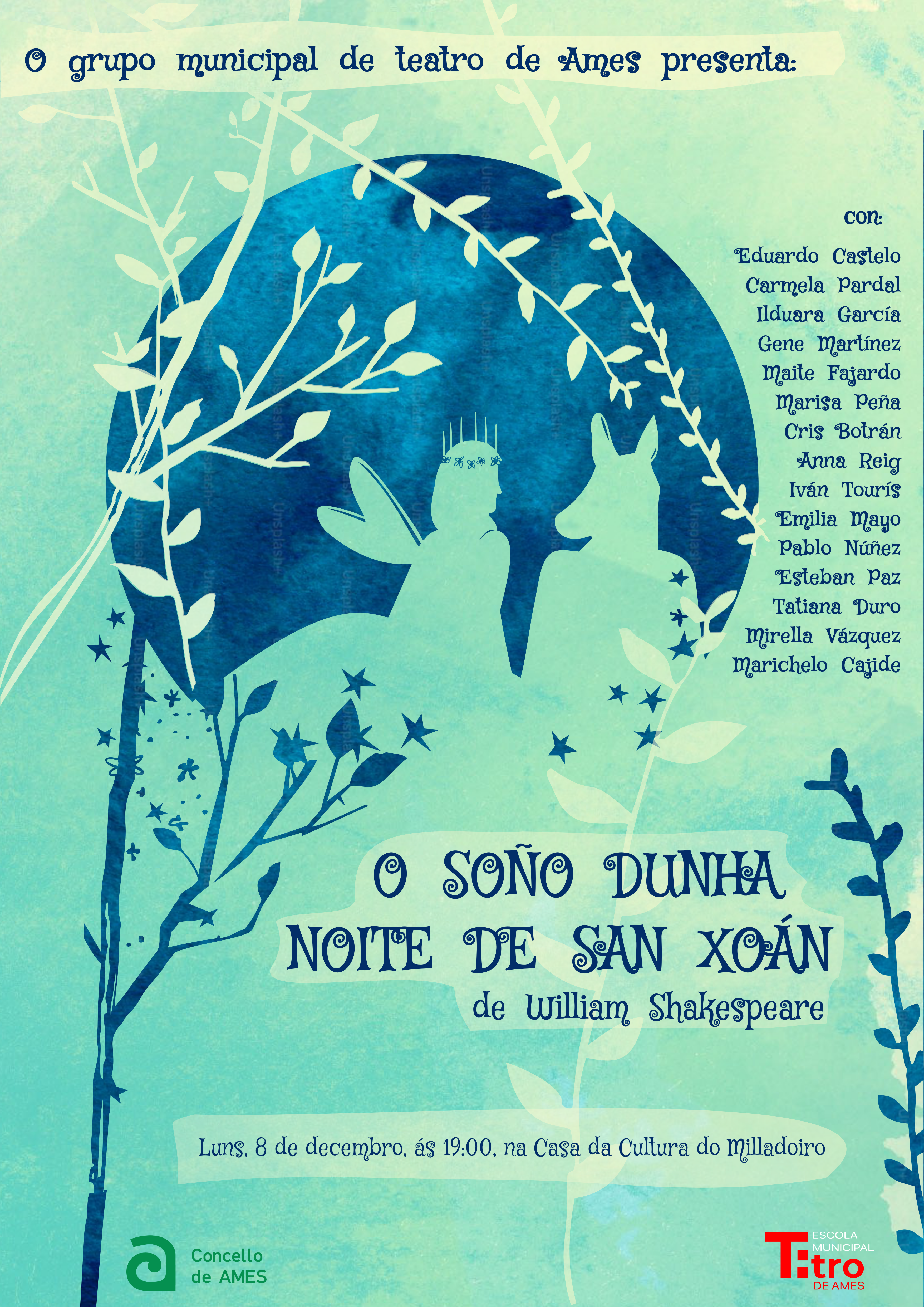 Todo pode pasar na noite máis curta do ano: dende dúas parellas de namorados que loitan polo dereito a estar xuntos (aínda que non teñan moi claro aínda con quen...), ata dúas meigas que compiten pola sona de ser a mellor. Fadas danzarinas, trasnos argalleiros, e mesmo un grupo de humildes artesás con ínfulas de artistas citaranse no medio da fraga nunha noite chea de amor e humor. Con Soño dunha noite de san Xoán, O Grupo Municipal de Teatro de Ames presenta unha das obras máis emblemáticas de Shakespeare e do teatro universal, grazas a cal poderemos pasar unha máxica velada onde celebrar a alegría e o gozo da vida mesma
