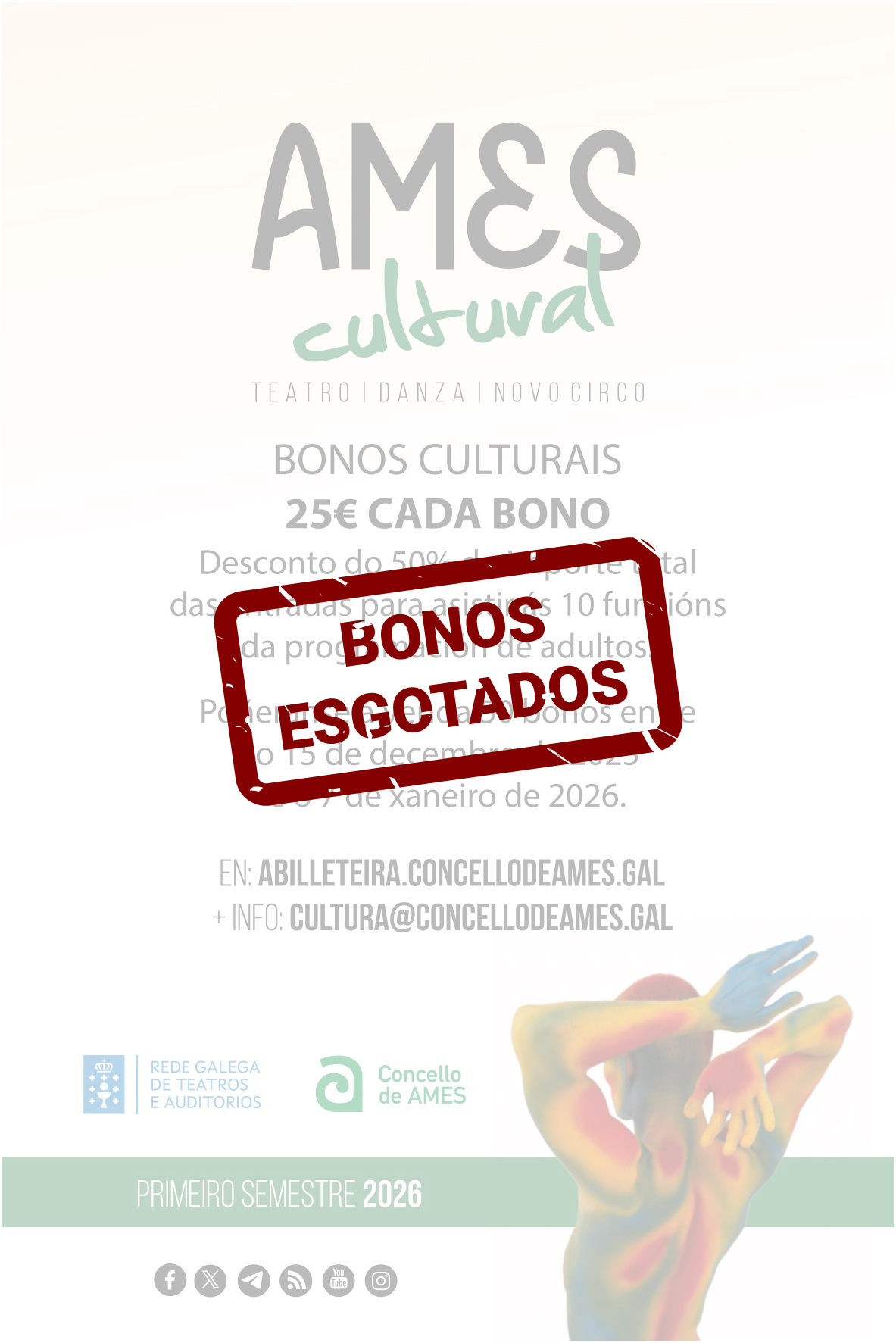 Hai 50 bonos culturais dispoñibles na Billeteira de Ames. Poñeranse á venda dende o luns 15 de decembro de 2025 ata o mércores 7 de xaneiro de 2026 (ou fin de existencias). A partir do día 8 de xaneiro de 2026 ás 12:00 poderanse mercar as entradas individuais para cada evento.